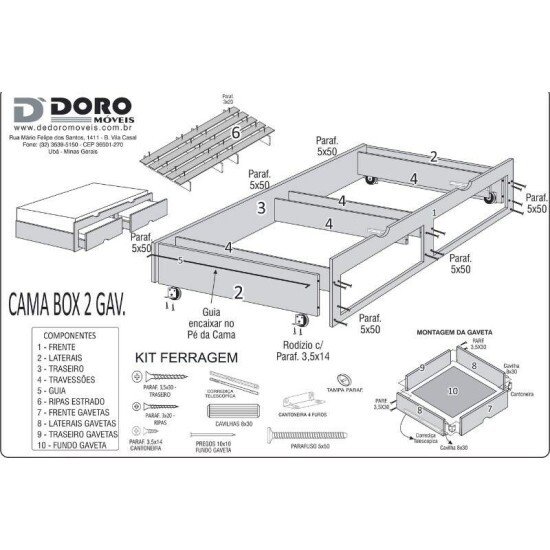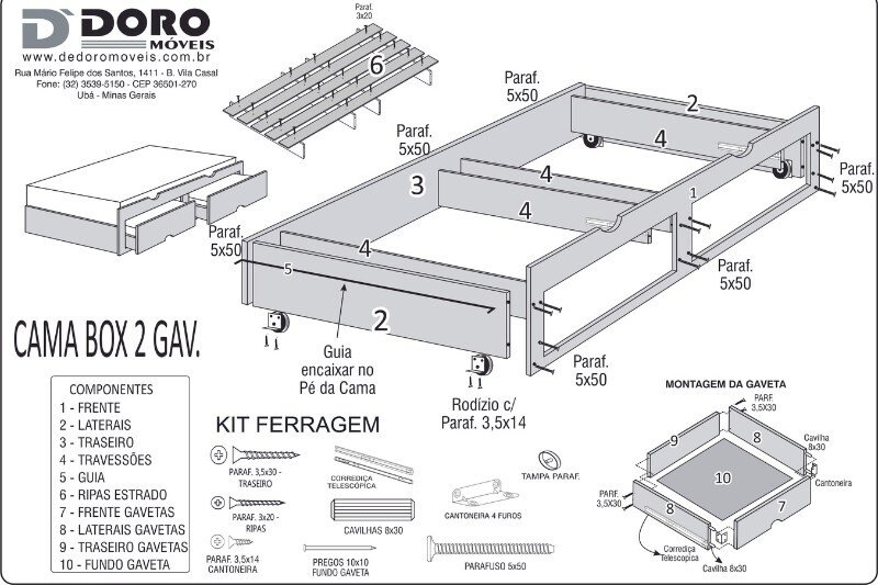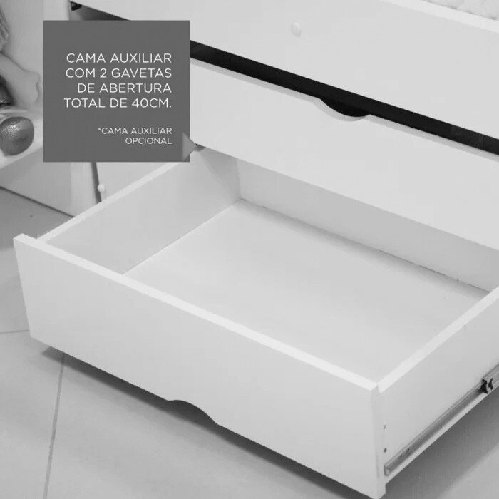 – Cama auxiliar com duas gavetas de abertura total de 40 cm