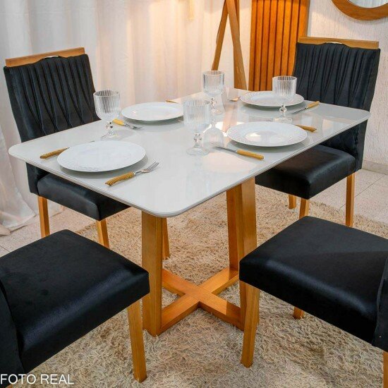 Mesa de Jantar Pedro 120×80 Vidro Off/Base Madeira + 4 Cad. Genova Veludo Preto 504 Madeira Art Assento – Entregue Montada
