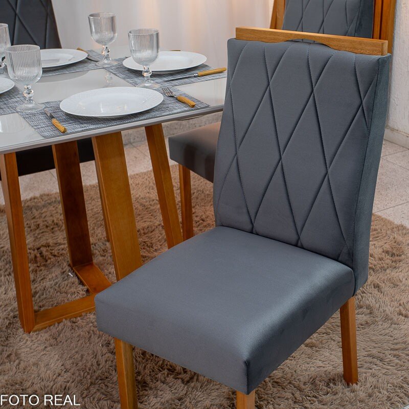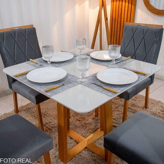 Mesa de Jantar Pedro 90×90 Vidro Off/Base Madeira + 4 Cad. Lisboa Veludo Cinza 507 Madeira Art Assento – Entregue Montada
